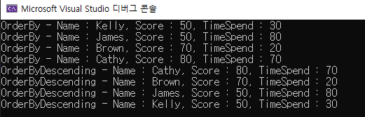OrderBy()를 호출하면 해당하는 데이터를 기준으로 오름차순(Ascending) 정렬한다.