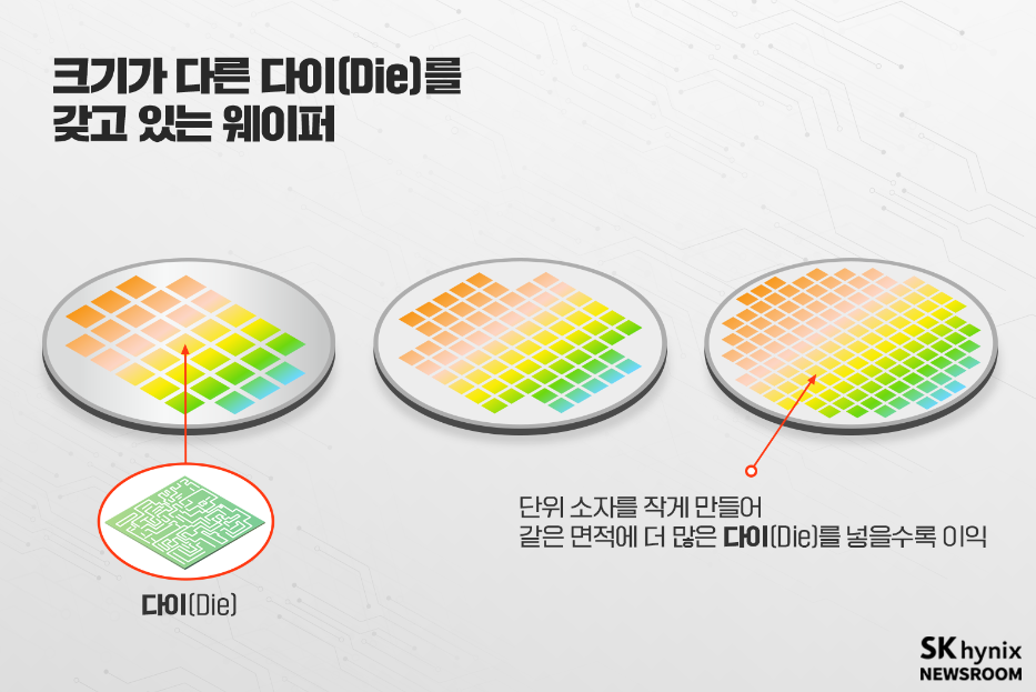 이러한 현대적인 반도체 집적 공정의 특징은 한 웨이퍼 위에 소자를 만드는 비용이 그 안에 그려진 소자의 수에 거의 영향을 받지 않고 비슷하다는 점이다. 즉, 웨이퍼 위에 같은 성능의 다이(Die, 칩을 만드는 단위)한 개를 그려 넣고 만드는 것이나 1,000개를 만드는 것이나 비슷한 비용이 든다. 그러나 한 개를 만드는 비용을 비교하면 1/1,000이 되므로 굉장한 원가 절감이 가능해진다. 그러므로 집적회로의 시대에는 트랜지스터와 같은 단위 소자를 작게 만들어 같은 면적에 더 많은 다이를 넣는 회사가 더 많은 돈을 벌 수 있는 것이다.