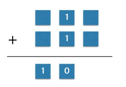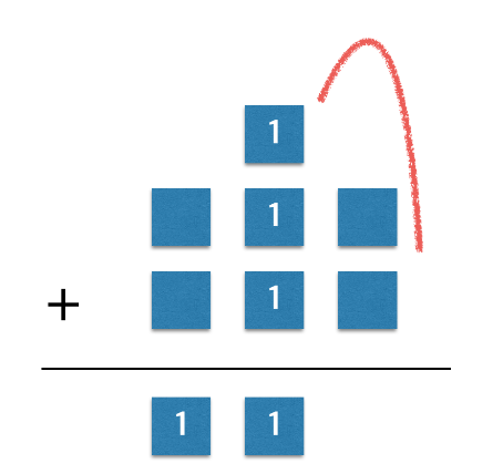이진수 덧셈 십진수와 이진수에서 중요한 차이점 중 하나는 이진수에서 훨씬 간단한 표를 사용한다는 점이다. 여러분이 돌고래 사회에서 자랐다면 위의 표를 학교에서 배웠을 테고 아래와 같은