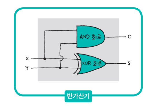 AND 게이트와 XOR 게이트를 이렇게 결합하면 이진수 한자리 덧셈을 계산할 수 있다.