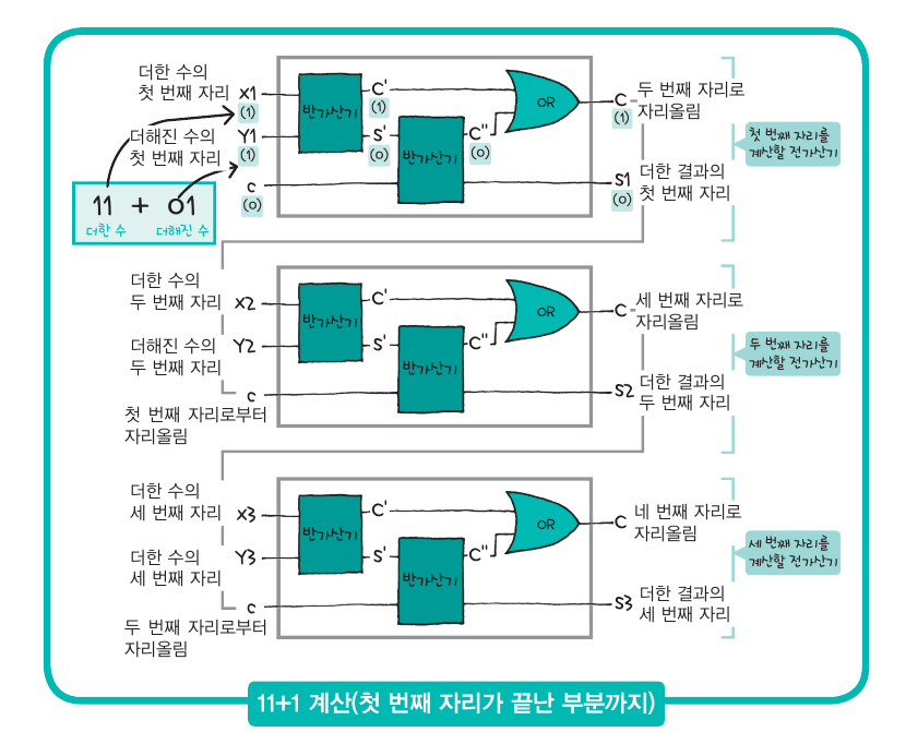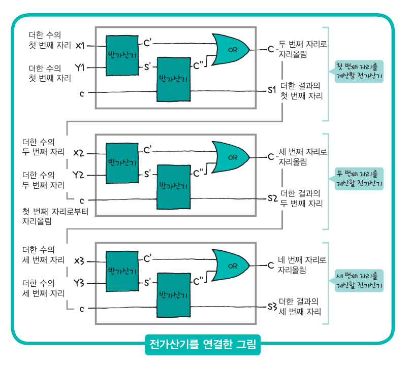 믿기지 않겠지만 두 자릿수 이상의 덧셈이 가능해졌다. 이제 전가산기를 쭉 연결하기만 하면 된다.