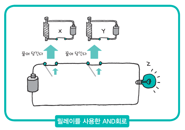 예를 들어, 다음과 같이 스위치를 연결하면 Z에 전류가 흐르는 것은 X와 Y 양쪽에 전류가 흐를 때뿐이다. 전류가 흐르는 상태를 1, 흐르지 않는 상태를 0이라고 하면, Z에 전류가 흐르는지의 여부는 X ✕ Y로 구할 수 있다.