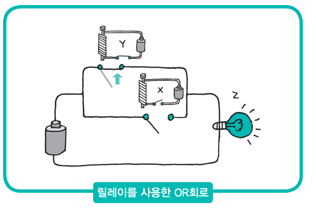 다음과 같이 스위치를 병렬로 연결한 경우를 살펴보면, Z에 전류가 흐르는 것은 X와 Y가 적어도 한쪽 방향으로 전류가 흐를 때뿐이다. 전류가 흐르는 상태를 1, 흐르지 않는 상태를 0이라 하면, Z에 전류가 흐르는지의 여부는 X + Y로 구할 수 있다.