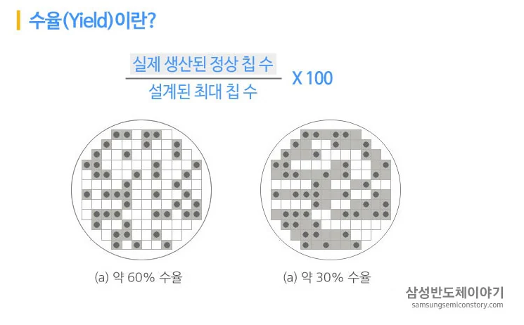 반도체에서 수율은 결함이 없는 합격품의 비율을 말한다.