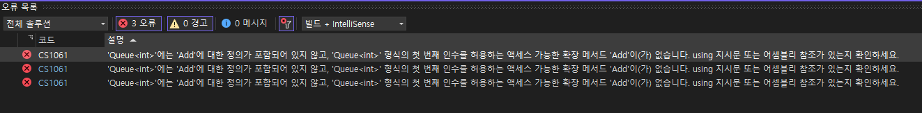 Queue<int> Q1 = new Queue<int> { 1, 2, 3 }; // error 발생