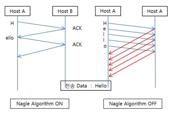 - 인터넷 전화나 1인칭 슈팅 게임과 같이 빠른 응답속도가 필요한 TCP 응용 프로그램에 Nagle 알고리즘이 적용되면 제대로 작동하지 않을 수 있다.