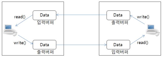 위 그림에서 write()함수를 통해 출력 버퍼에 데이터가 전달되고 입력 버퍼로 전달된 데이터는 read() 함수를 통해 수신하게 된다. 즉, 수신자가 데이터를 수신하는 시점은 송신자가 write() 함수를 호출했을 때가 아니라 수신자가 read() 함수를 호출하는 시점이다.