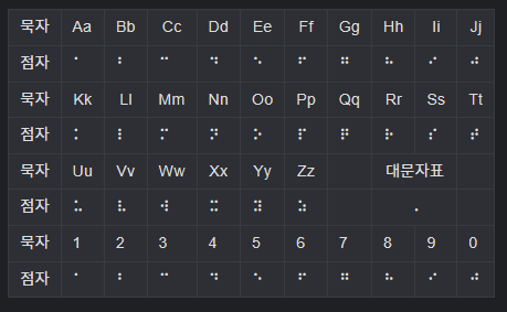 묵자AaBbCcDdEeFfGgHhIiJj점자⠁⠃⠉⠙⠑⠋⠛⠓⠊⠚묵자KkLlMmNnOoPpQqRrSsTt점자⠅⠇⠍⠝⠕⠏⠟⠗⠎⠞묵자UuVvWwXxYyZz대문자표점자⠥⠧⠺⠭⠽⠵⠠묵자1234567890점자⠁⠃⠉⠙⠑⠋⠛⠓⠊⠚ 위 표에는 대문