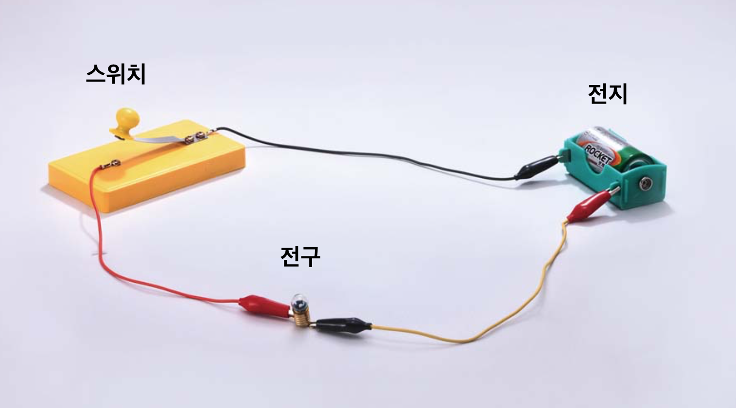 지금 우리가 만든 것은 간단한 전기 회로이며, 여기서 회로가 원형의 순환 형태를 하고 있다는 점에 주목해야 합니다. 전지에서 전선으로, 전선에서 전구로, 전구에서 스위치로, 스위치에서 다시 전지로 가는 경로에 끊김이 없을 때만 전구에 불이 들어오게 됩니다. 이 회로에서 어떤 끊김이 있으면 전구에 불은 들어오지 않지요. 스위치는 이런 과정을 제어하는 역할을 합니다.