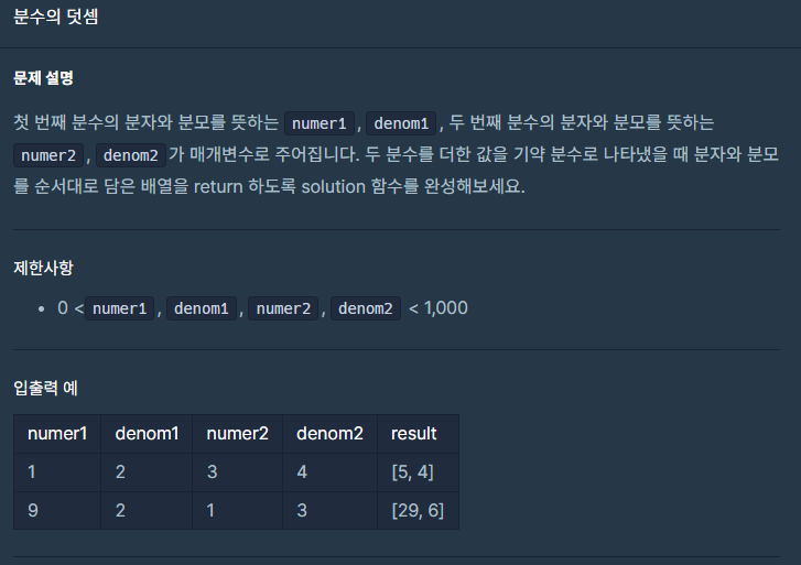 첫 번째 분수의 분자와 분모를 뜻하는 numer1, denom1, 두 번째 분수의 분자와 분모를 뜻하는 numer2, denom2가 매개변수로 주어집니다. 두 분수를 더한 값을 기약 분수로 나타냈을 때 분자와 분모를 순서대로 담은 배열을 return 하도록 solution 함수를 완성해보세요.