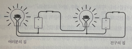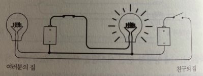 이것이 별로 특이한 발상이 아니라는 걸 확인하기 위하여 이 부분에 대해서 좀 더 자세히 살펴봅시다. 일단 여러분 집에 있는 스위치를 누르면 친구 집에 있는 전구에 불이 들어오겠지요. 그림에서 굵은 선은 회로에서의 전기 흐름을 보여주고 있습니다.
