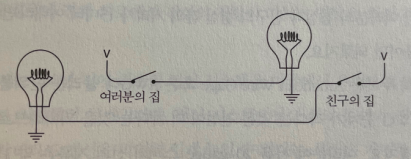 만일 높은 전압의 전지와 전구를 사용하고 있다면 한쪽 연결에는 접지를 사용 하여 여러분의 집과 친구의 집 사이에 오직 하나의 선만 지나가도록 만들 수 있습니다.