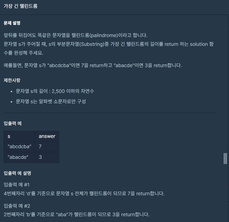 문자열 s가 주어질 때, s의 부분문자열(Substring)중 가장 긴 팰린드롬의 길이를 return 하는 solution 함수를 완성해 주세요.