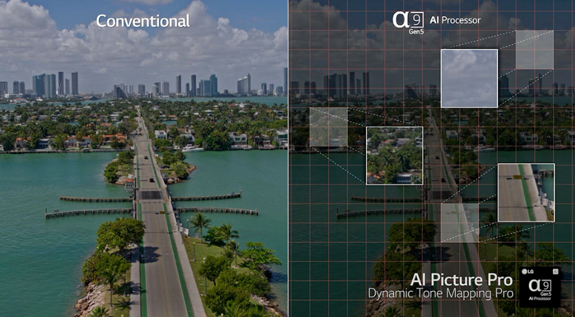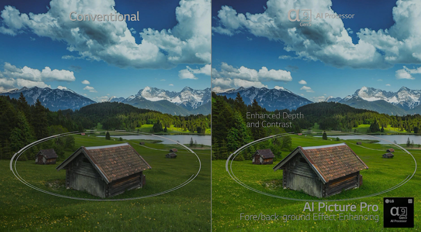 TV 영상 콘텐츠 종류는 게임, 영화등 다양하다. 영화, 스포츠 등 영상 종류에 따라 잘 어울리는 화질과 사운드는 다 다를텐데, 영상의 종류를 인식해 최적화된 화질과 사운드를 제공한다. 그리고 영상을 장면 단위로 분석해 4가지 스타일(풍경/야경/도시/표준) 중 가장 어울리는 테마로 설정해 주어 몰입감 있는 경험을 제공한다.