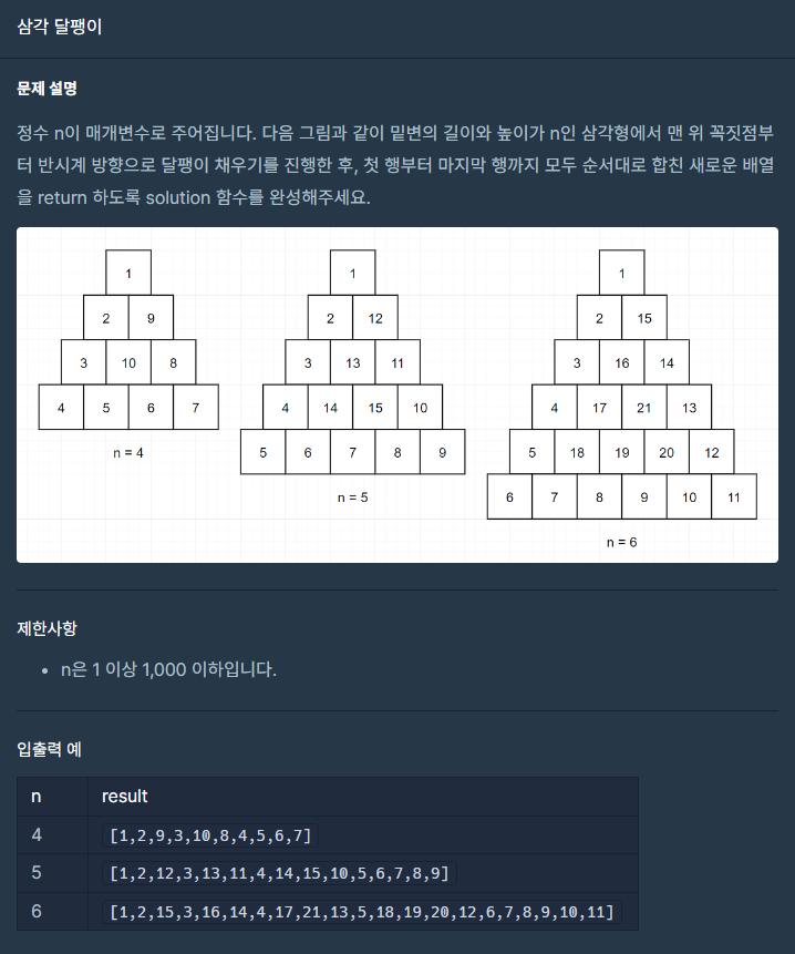 정수 n이 매개변수로 주어집니다. 다음 그림과 같이 밑변의 길이와 높이가 n인 삼각형에서 맨 위 꼭짓점부터 반시계 방향으로 달팽이 채우기를 진행한 후, 첫 행부터 마지막 행까지 모두 순서대로 합친 새로운 배열을 return 하도록 solution 함수를 완성해주세요.