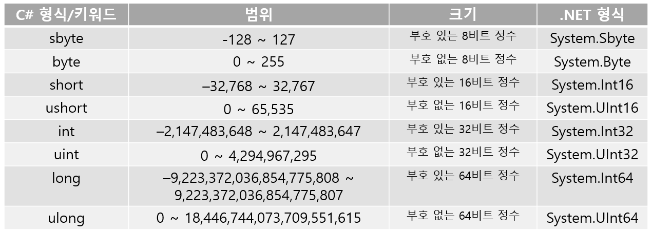 정수 숫자 형식은 정수(Integer)를 표현한다. 모든 정수 숫자 형식은 값 형식이다. 또한 간단한 형식이며 리터럴을 사용하여 초기화할 수 있다. 모든 정수 숫자 형식은 산술, 비트 논리, 비교 및 같음 연산자를 지원한다.