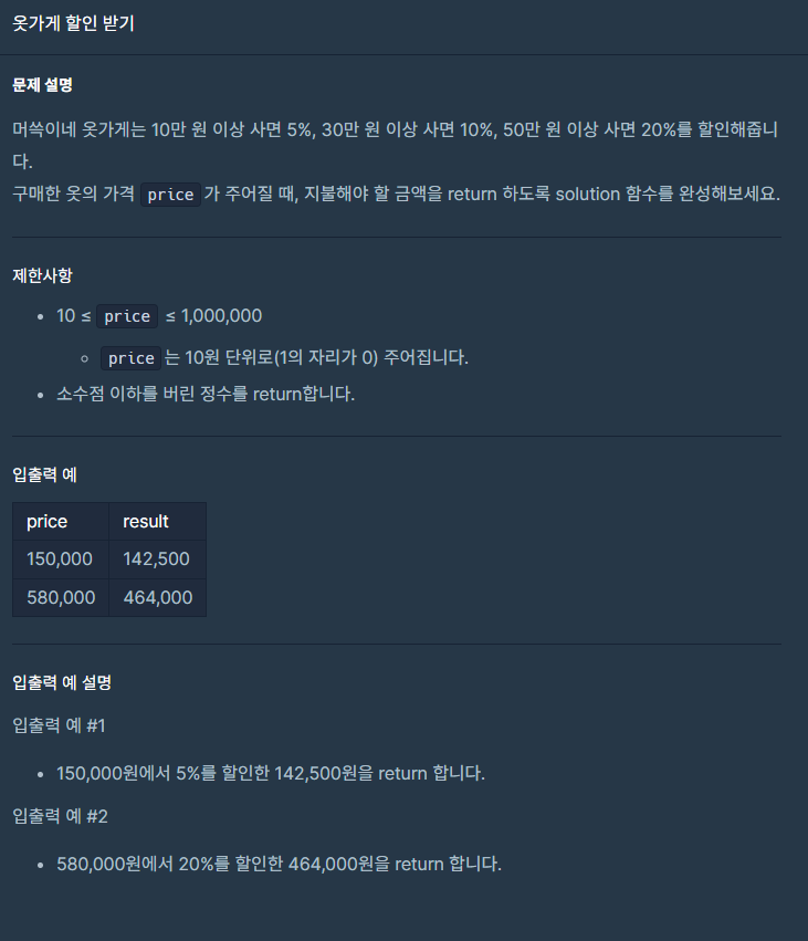 구매한 옷의 가격 price가 주어질 때, 지불해야 할 금액을 return 하도록 solution 함수를 완성해보세요.