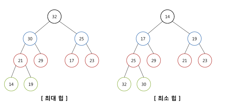 - 완전 이진 트리(Complete Binary Tree)의 일종으로 우선순위 큐를 위하여 만들어진 자료구조