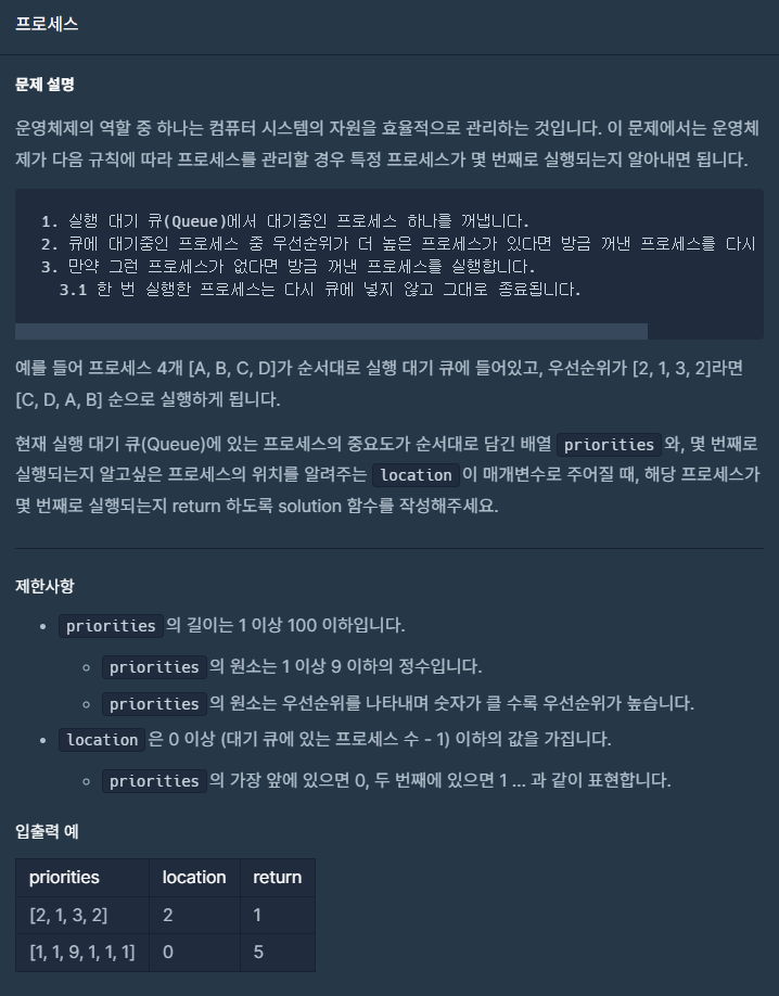 현재 실행 대기 큐(Queue)에 있는 프로세스의 중요도가 순서대로 담긴 배열 priorities와, 몇 번째로 실행되는지 알고싶은 프로세스의 위치를 알려주는 location이 매개변수로 주어질 때, 해당 프로세스가 몇 번째로 실행되는지 return 하도록 solution 함수를 작성해주세요.