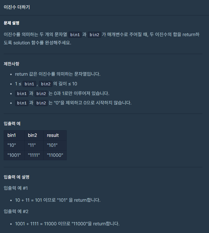 이진수를 의미하는 두 개의 문자열 bin1과 bin2가 매개변수로 주어질 때, 두 이진수의 합을 return하도록 solution 함수를 완성해주세요.