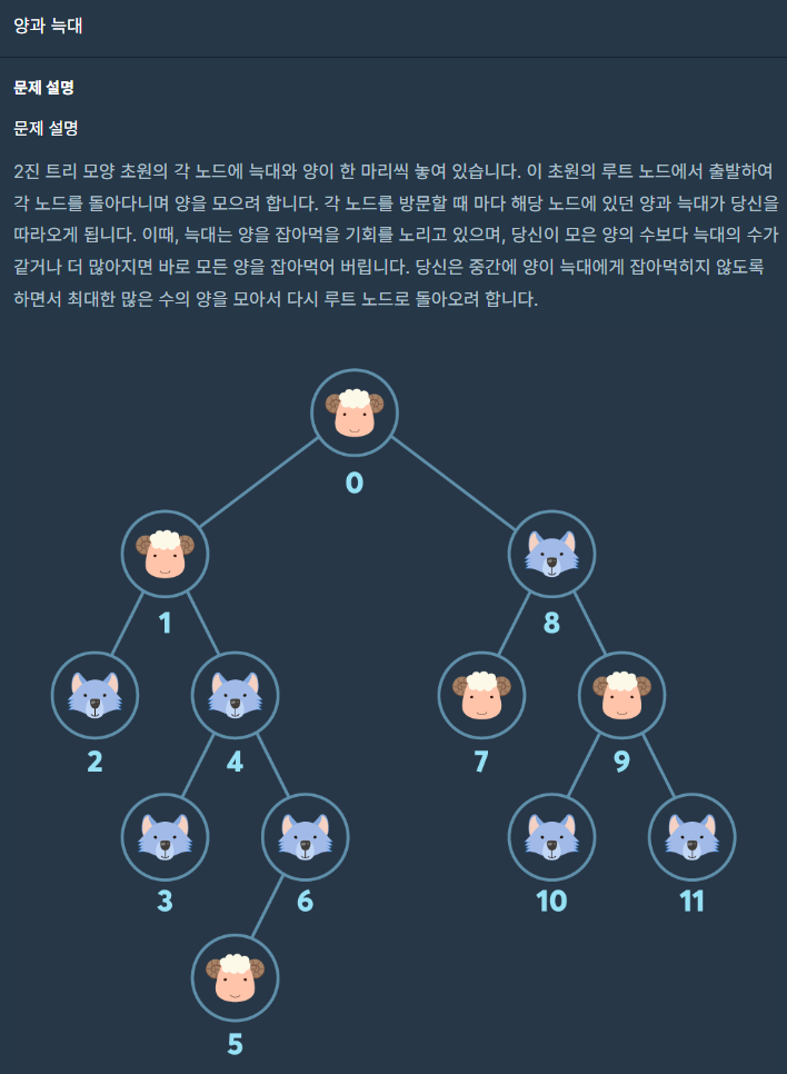 2진 트리 모양 초원의 각 노드에 늑대와 양이 한 마리씩 놓여 있습니다. 이 초원의 루트 노드에서 출발하여 각 노드를 돌아다니며 양을 모으려 합니다. 각 노드를 방문할 때 마다 해당 노드에 있던 양과 늑대가 당신을 따라오게 됩니다. 이때, 늑대는 양을 잡아먹을 기회를 노리고 있으며, 당신이 모은 양의 수보다 늑대의 수가 같거나 더 많아지면 바로 모든 양을 잡아먹어 버립니다. 당신은 중간에 양이 늑대에게 잡아먹히지 않도록 하면서 최대한 많은 수의 양을 모아서 다시 루트 노드로 돌아오려 합니다.