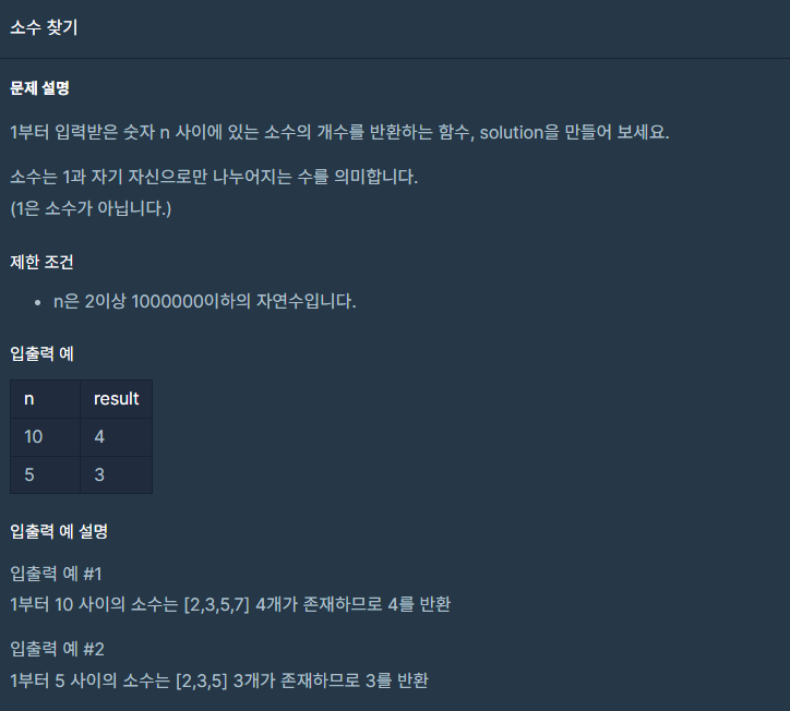 1부터 입력받은 숫자 n 사이에 있는 소수의 개수를 반환하는 함수, solution을 만들어 보세요.
