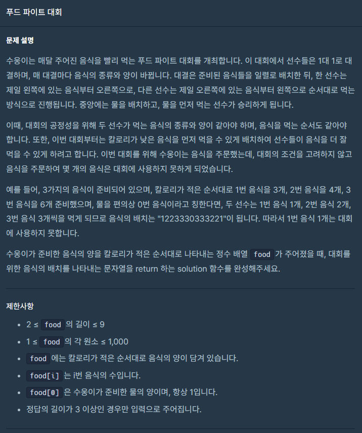 수웅이가 준비한 음식의 양을 칼로리가 적은 순서대로 나타내는 정수 배열 food가 주어졌을 때, 대회를 위한 음식의 배치를 나타내는 문자열을 return 하는 solution 함수를 완성해주세요.