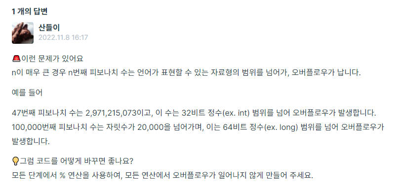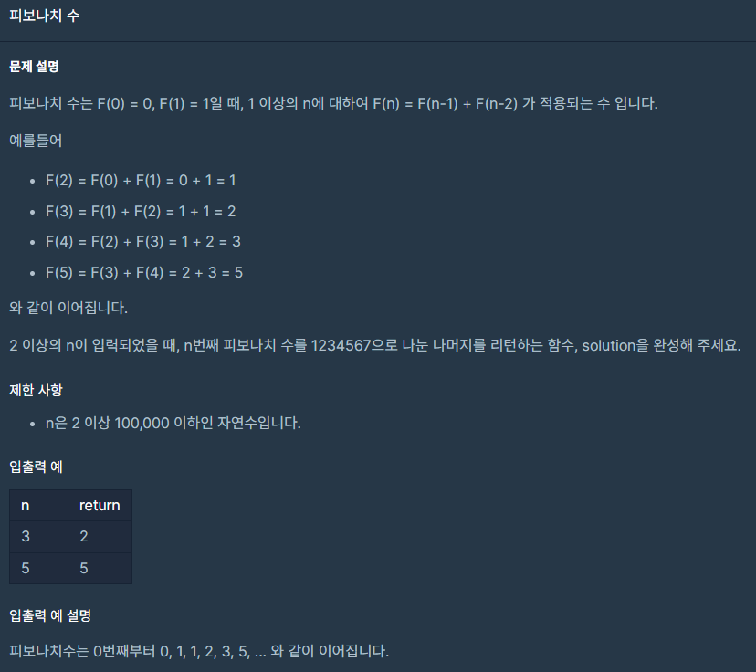 2 이상의 n이 입력되었을 때, n번째 피보나치 수를 1234567으로 나눈 나머지를 리턴하는 함수, solution을 완성해 주세요.