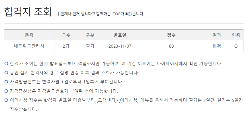 네트워크 관리사 2급 실기 합격 12월 3일에 실기 시험을 보고 12월 12일에 결과 발표가 이루어졌다. 이번 네트워크 관리사 2급 실기는 생각보다 쉽게 출제된 거 같다. (오히려 필기가 어렵다고 느껴