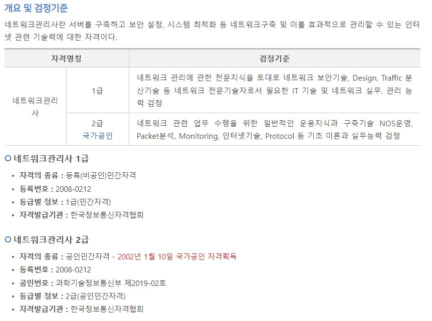 개요 및 검정기준 네트워크관리사란 서버를 구축하고 보안 설정, 시스템 최적화 등 네트워크구축 및 이를 효과적으로 관리할 수 있는 인터넷 관련 기술력에 대한 자격이다. 자격명칭 검정기준