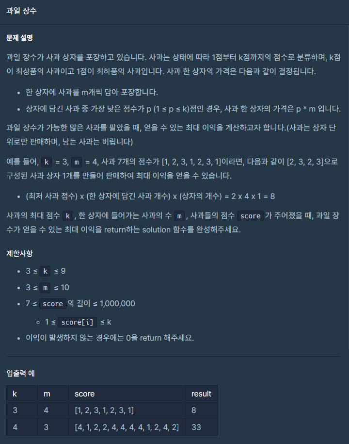 사과의 최대 점수 k, 한 상자에 들어가는 사과의 수 m, 사과들의 점수 score가 주어졌을 때, 과일 장수가 얻을 수 있는 최대 이익을 return하는 solution 함수를 완성해주세요.