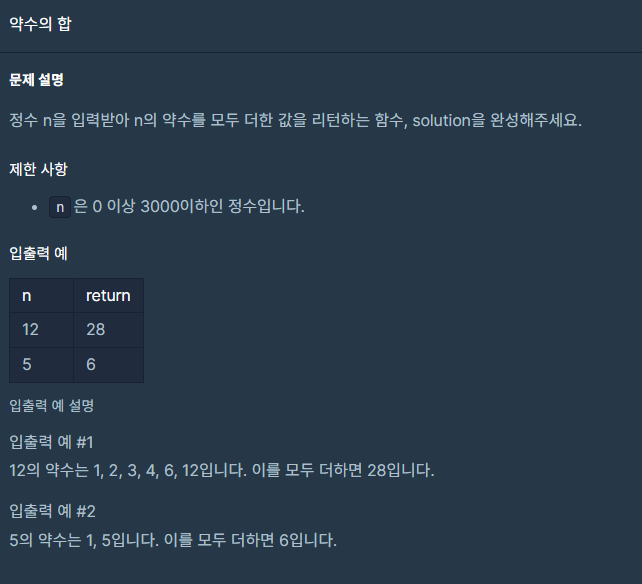 정수 n을 입력받아 n의 약수를 모두 더한 값을 리턴하는 함수, solution을 완성해주세요.