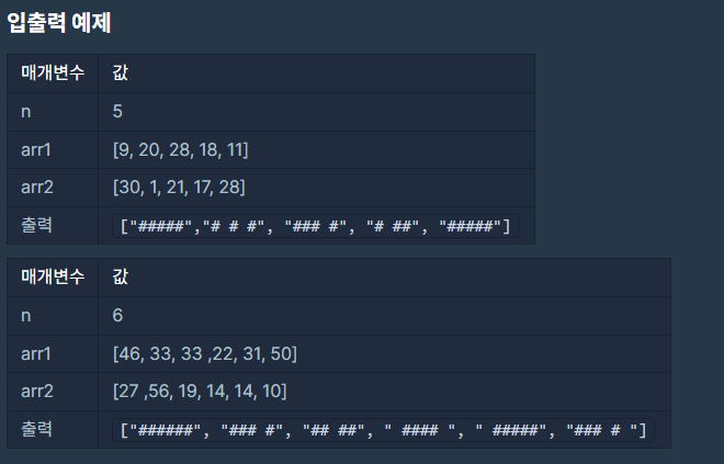 입력으로 지도의 한 변 크기 n과 2개의 정수 배열 arr1, arr2가 들어온다.