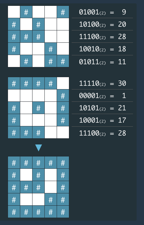 - 암호화된 배열은 지도의 각 가로줄에서 벽 부분을 1, 공백 부분을 0으로 부호화했을 때 얻어지는 이진수에 해당하는 값의 배열이다.
