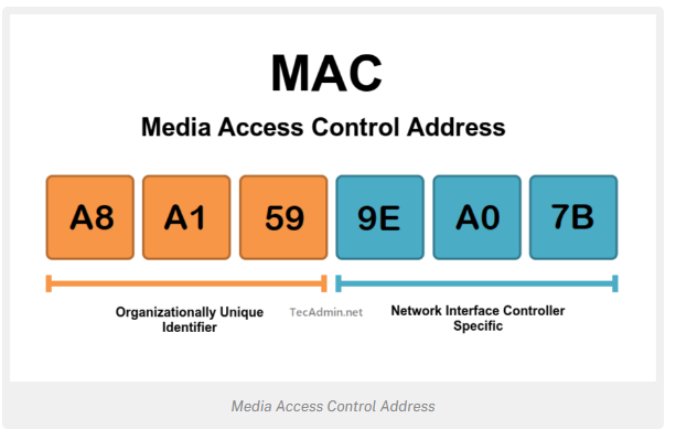 MAC 주소의 처음 3쌍(ex. A8:A1:59)은 IEEE(Institute of Electrical and Electronics Engineers)에서 할당하고 NIC 제조업체를 식별한다. 해당 번호가 OUI(조직 고유 식별자)이다. 예를 들어, Dell에서 제조한 네트워크 카드에 물리적 주소가 있다고 가정하면, 00-14-22-04-25-37 이 주소에서 00-14-22가 Dell 제품임을 식별하는 Dell의 OUI이다.