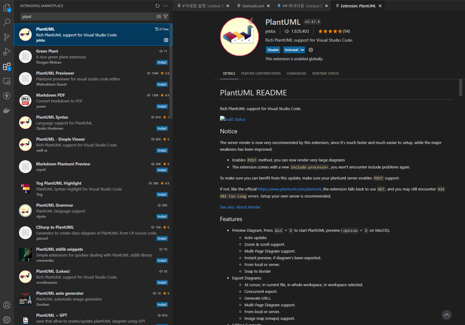 Ctrl + Shift + X를 누르거나 Extensions 메뉴를 찾아들어가서 PlantUML을 검색해서 설치하자.