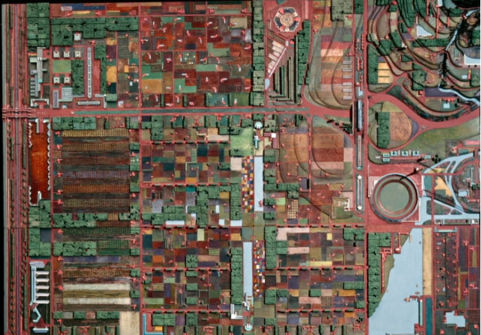 프랭크 로이드 라이트의 조그맣고 표준적인 주택들에는 모두 과하게 큰 정원이 딸려 있다. 자세히 들여다보면 이것이 텃밭임을 알 수 있다. 미래에는 텃밭에서 먹을 걸 마련한다고? 녹색혁명은 어디로 갔지? 현대에 값싼 당근과 저렴한 가공식품을 선사한 농업의 기계화는 어떻게 된 걸까? 세계적으로 유명한 건축가의 미래 전망은 그저 과거로의 비약적 뒷걸음질일 뿐인 걸까? 현대인의 시각으로 <브로드에이커 시티>를 한눈에 이해하기는 어렵다. 일단 개념 자체가 난감하다. 라이트의 미래 도시에 대한 전망은 오늘날과는 꽤 사고방식이 달랐던 시대의 산물이고 우리가 아는 현재와 전혀 닮지 않은 미래를 그린 작품이었다.
