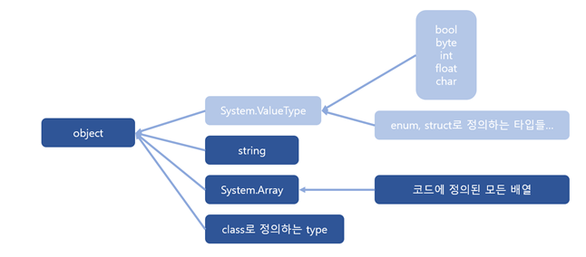 System.ValueType, bool, byte, int, float, char, enum, struct로 정의하는 타입들이 값 타입(value Type)이다.