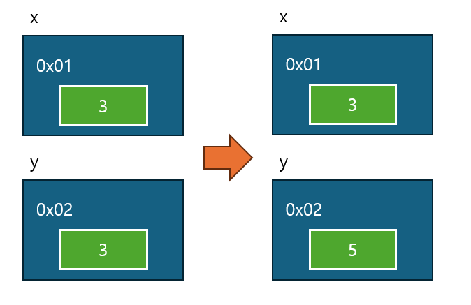 그래서 함수를 통해서 y를 아무리 변경해 봤자 x는 변경되지 않는다.