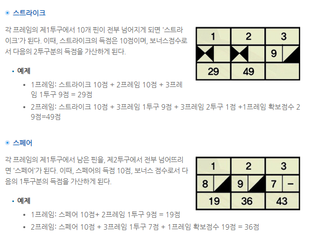 - 스페어 이후에 공 1개의 점수를 보너스로 받는다.