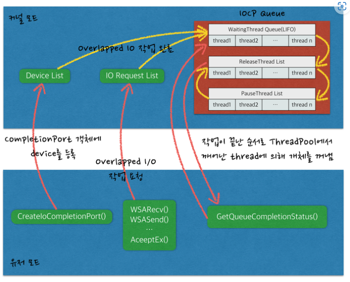 IOCP는 비동기(Asynchronous) + 스레드 풀링(Thread Pooling) + 논 블로킹(Non-Blocking) + 중첩 입출력(Overlapped I/O)과 같은 개념들을 이용해서 작동한다.