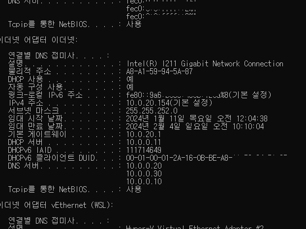 cmd 창에서 'ipconfig /all' 명령어 입력