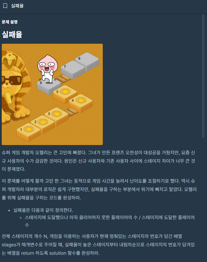 전체 스테이지의 개수 N, 게임을 이용하는 사용자가 현재 멈춰있는 스테이지의 번호가 담긴 배열 stages가 매개변수로 주어질 때, 실패율이 높은 스테이지부터 내림차순으로 스테이지의 번호가 담겨있는 배열을 return 하도록 solution 함수를 완성하라.