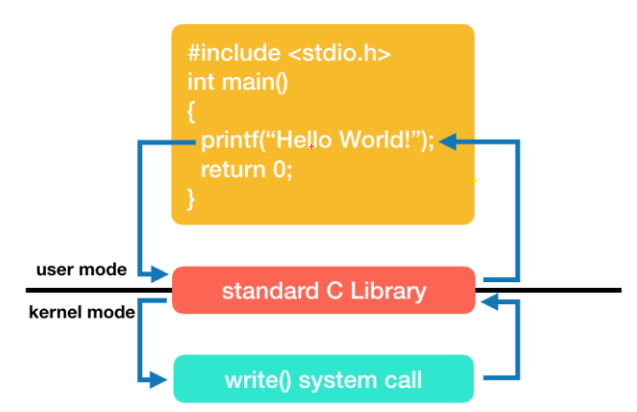 printf() 함수는 사용자 모드에서 수행되어 stdio 라이브러리를 호출한다. stdio 라이브러리는 시스템 콜인 write() 메서드를 호출하고, 실행의 흐름은 커널 모드로 바뀐다. 커널은 호출을 실행하여 모니터에 문자열을 출력하고 실행의 흐름을 다시 사용자 모드에게 넘긴다. printf() 함수의 다음 단계를 마저 진행한다.
