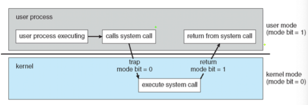 Mode bit로 해당 모드를 구분하며 0은 '커널 모드(kernel Mode)', 1은 '사용자 모드(user mode)'로 나뉘어서 구동된다. 프로그램이 구동되는 데 있어서 파일을 읽거나, 쓰거나, 혹은 화면에 메시지를 출력하는 등 많은 부분이 커널 모드를 사용한다.