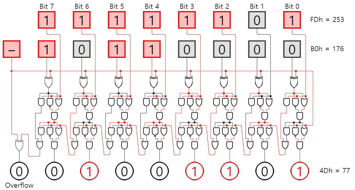 뺄셈에서 빼는 수가 빼어지는 수보다 작은 경우에는 덧셈기의 CO 출력으로 1이 출력된다. 이는 뺼셈의 마지막 단계에서 100000000이 빼어져야 함을 의미하므로 당연한 것이다. 따라서 오버플로/언더플로를 나타내는 전구는 덧셈기의 CO 출력이 0인 경우에 불이 들어와야 한다.