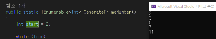 yield return에 대해서 공부하면서 대량의 데이터를 다루기 편해지고 지연 로딩이 강점이라는 설명글들을 많이 읽었지만 "그래서 이걸 대체 어디에 사용하지?"라는 의문에 계속해서 들고 있었다. 그러다가 피보나치 수열을 만드는 예제를 보고 yield return을 사용해서 소수를 만드는 메서드를 만들면 좋을거 같다는 생각이 들어서 코드를 한번 짜봤다.