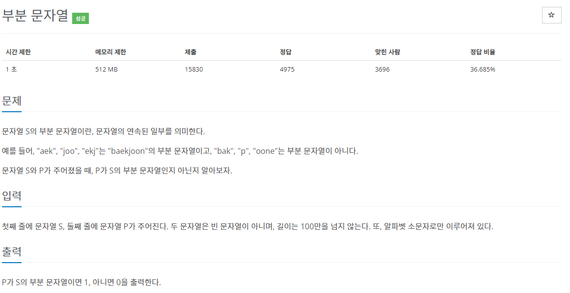 문자열 S와 P가 주어졌을 때, P가 S의 부분 문자열인지 아닌지 알아보자.