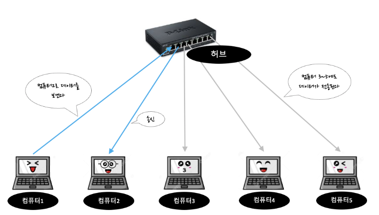 컴퓨터 1에서 컴퓨터 2로만 데이터를 보내려고 해도, 허브에 컴퓨터(1,2,3,4,5)가 연결되어 있다면 컴퓨터 2뿐만 아니라 다른 컴퓨터 (3,4,5)에도 불필요한 데이터가 전송되는 문제점이 있다.