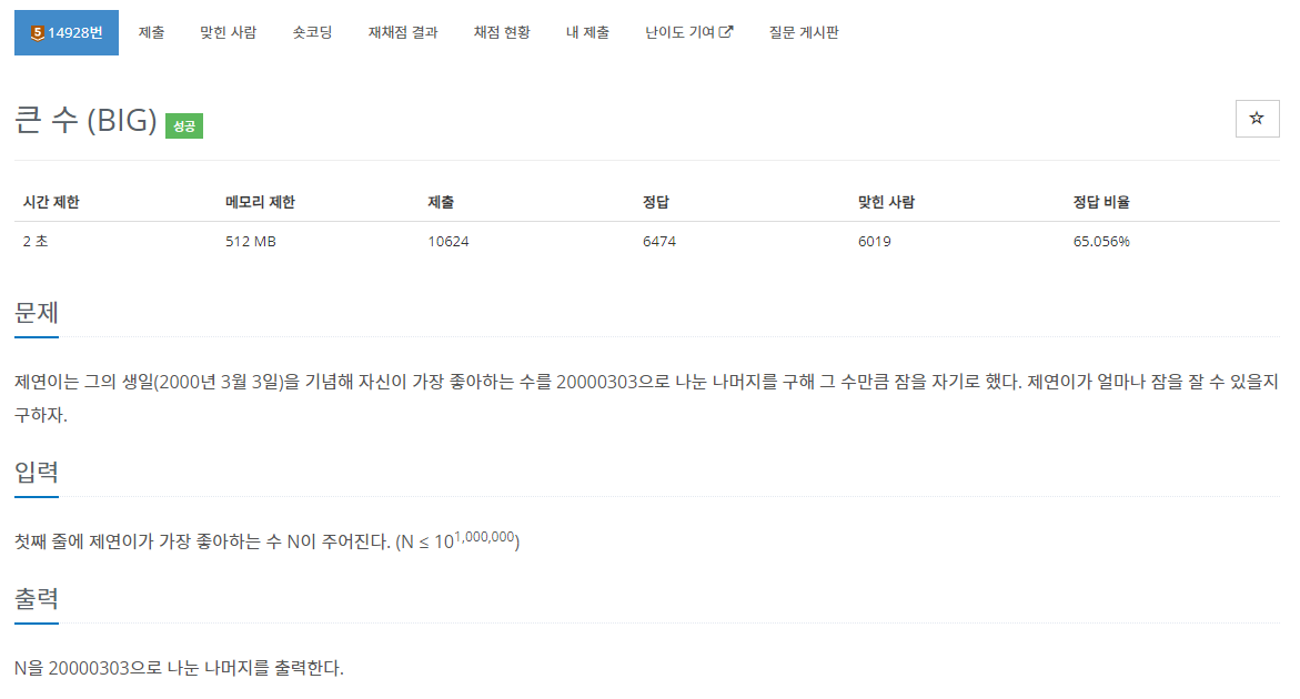 제연이는 그의 생일(2000년 3월 3일)을 기념해 자신이 가장 좋아하는 수를 20000303으로 나눈 나머지를 구해 그 수만큼 잠을 자기로 했다. 제연이가 얼마나 잠을 잘 수 있을지 구하자.